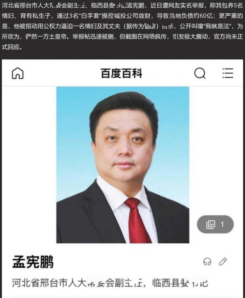 【6】✨河北省邢台市常萎会副柱任 孟宪鹏 被人实名举报腐败杀人 包养多名情人引发大震动!