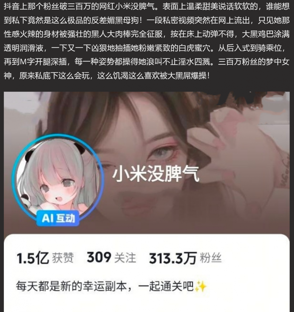 【5】❤️抖音热瓜!三百万粉丝网红 小米没脾气 私下竟是媚黑母狗 被大肉棒疯狂抽插视频流出!